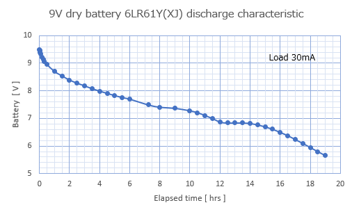 また、電池の放電終止電圧 6V に達するのは18時間なので、この Panasonic製 9V 角型アルカリ乾電池の容量は、30mA定電流負荷において